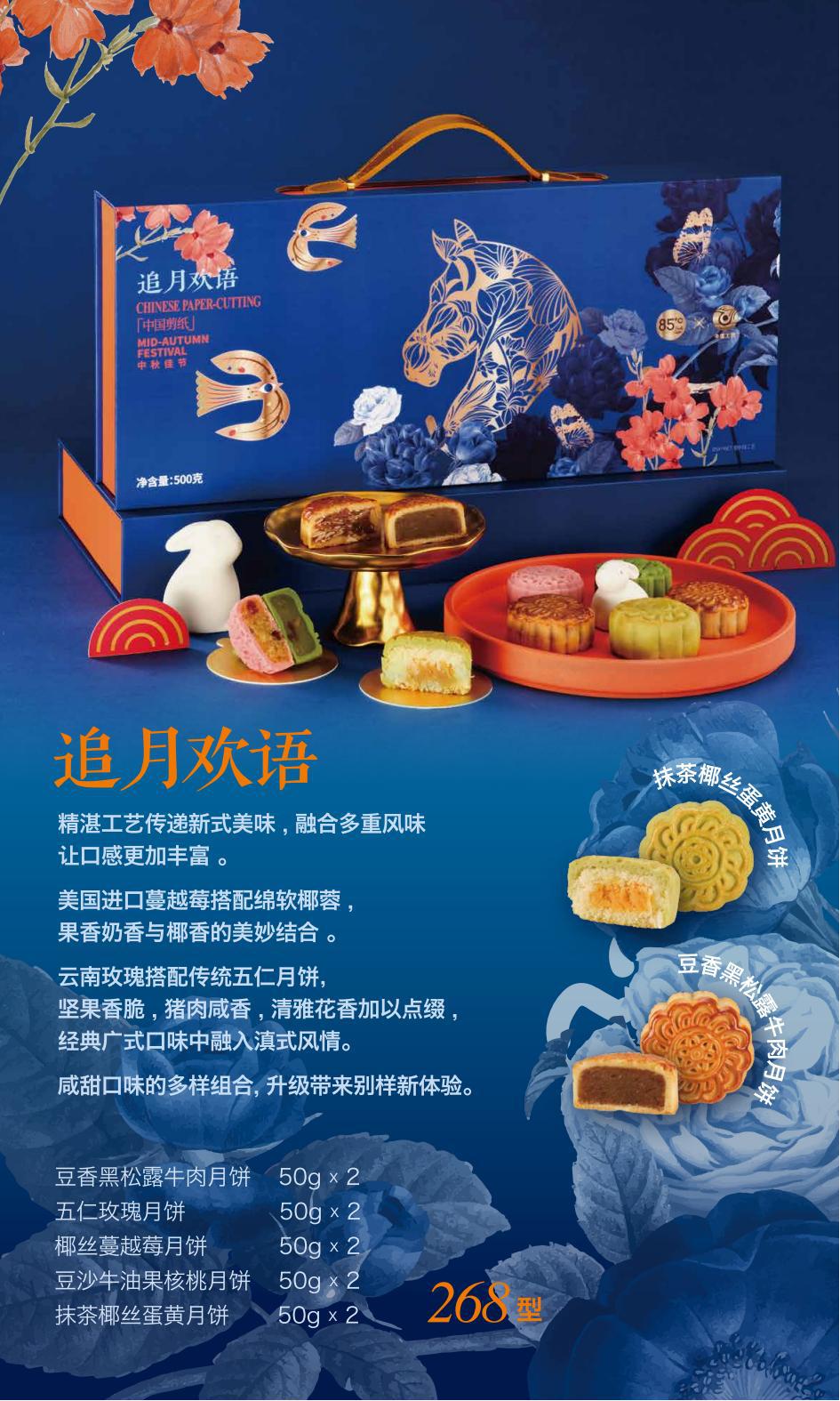 介绍:五仁玫瑰月饼50g*2 椰丝蔓越莓月饼50g*2 豆沙牛油果核桃月饼50g*2 豆香黑松露牛肉月饼50g*2 斑斓椰丝蛋黄月饼50g*2