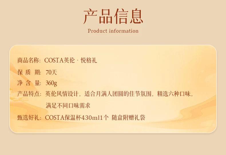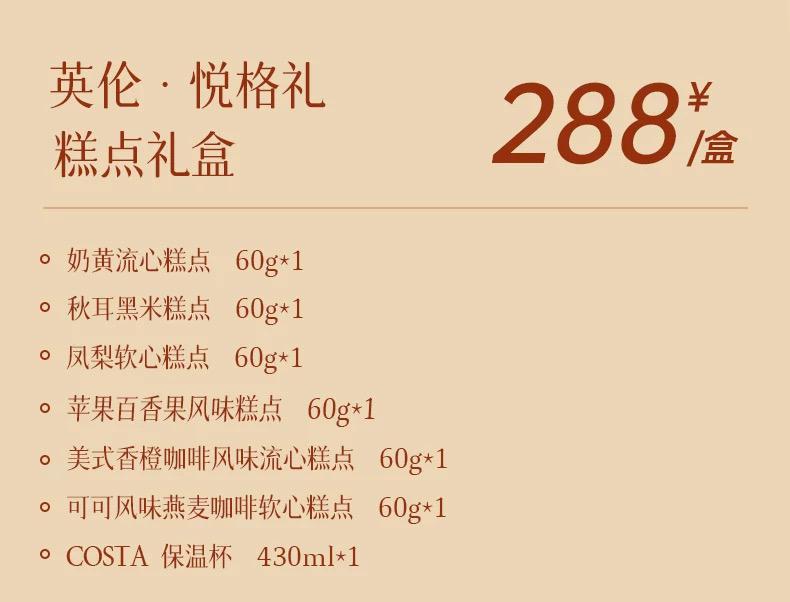 介绍:奶黄流心糕点60g*1 美式香橙咖啡风味流心糕点60g*1 可可风味燕麦咖啡软心糕点60g*1 苹果百香果风味糕点60g*1 凤梨软心糕点60g*1 秋耳黑米糕点60g*1 COSTA 保温杯430ml*1
