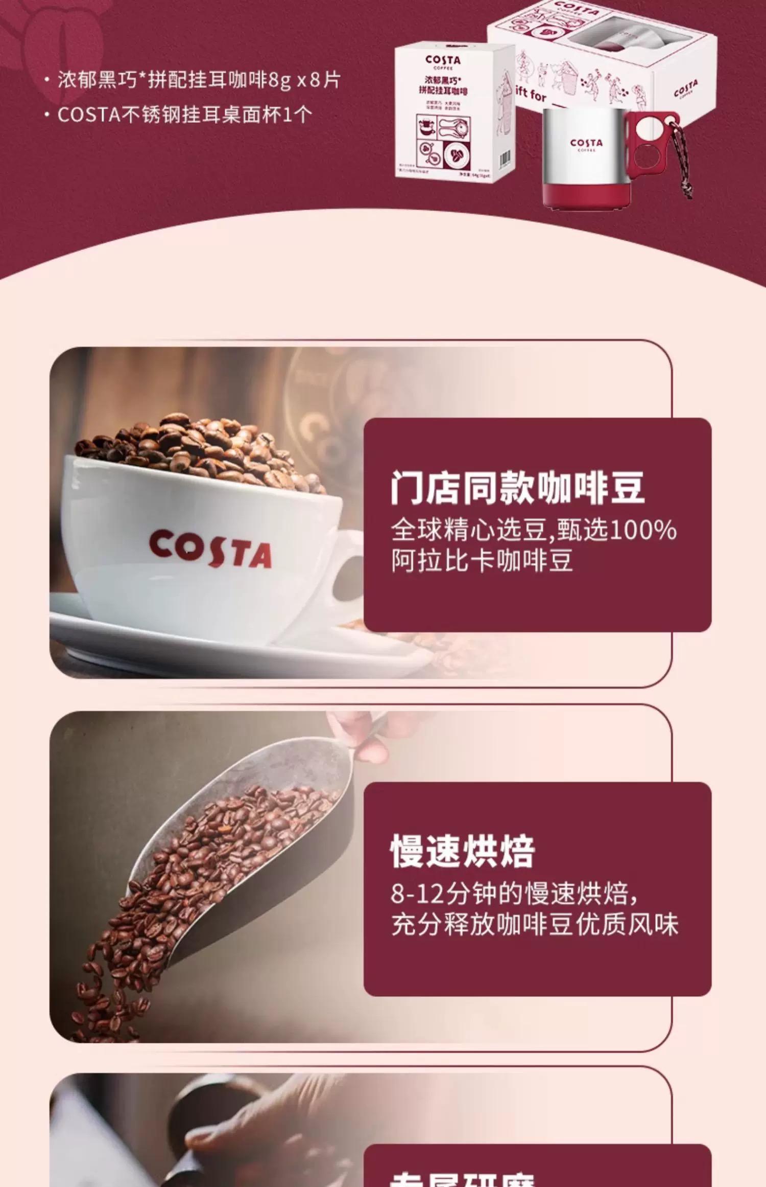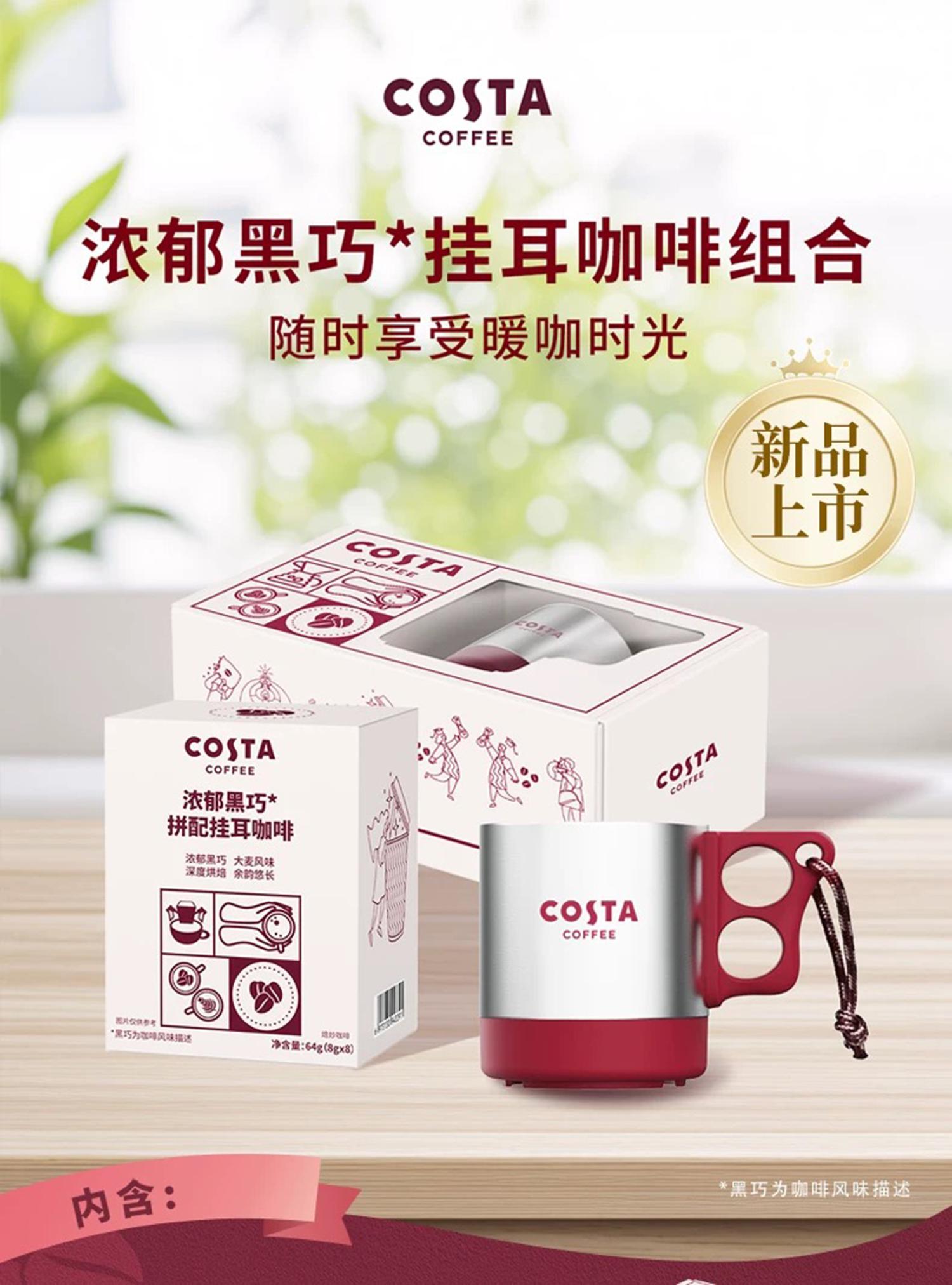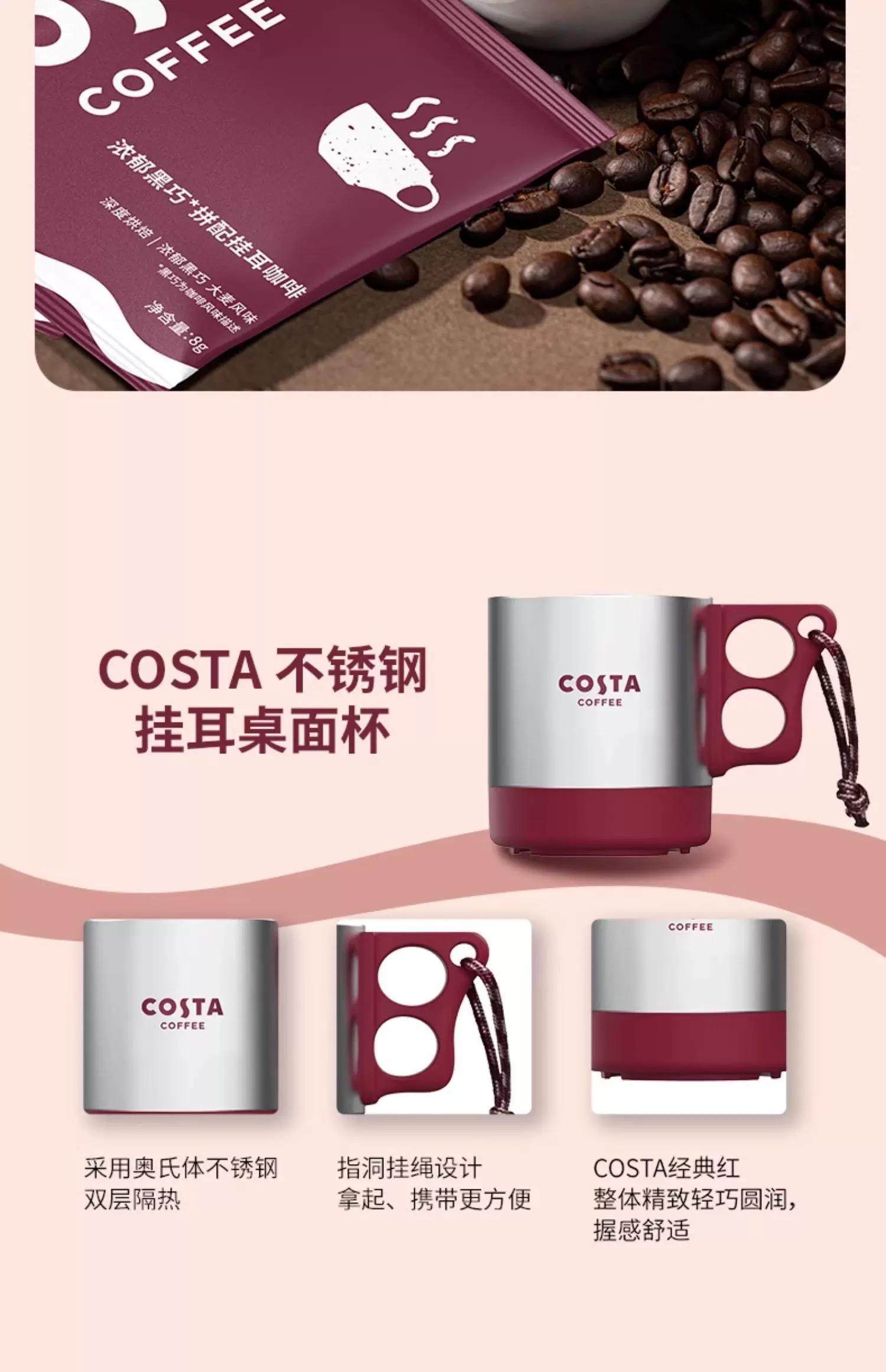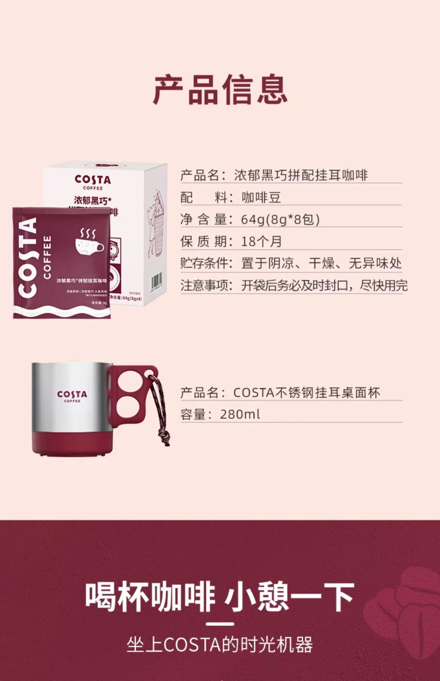 介绍:浓郁黑巧挂耳64g(8g*8) COSTA不锈钢挂耳桌面杯280ml