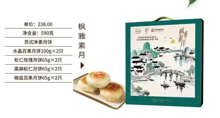 介绍:苏式净素月饼 水晶百果月饼100gx2只 松仁玫瑰月饼65gx2只 黑麻松仁月饼65gx2只 椒盐百果月饼65gx2只