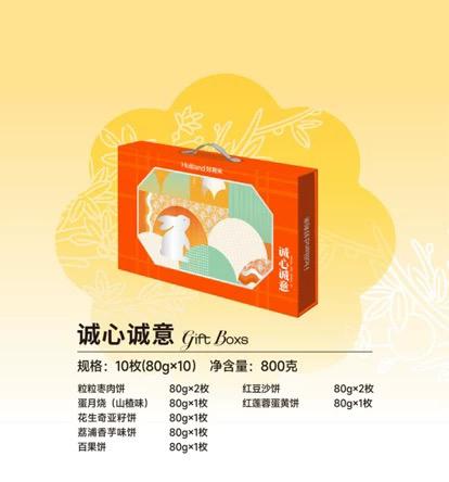 介绍:蛋黄红莲月饼80克*1粒 醇香粒粒枣肉饼80g*2粒 蛋月烧(山楂味) 80g*1 奇亚籽花生饼 80g*1 荔浦香芋饼 80g*1 百果月饼 80g*2 粒粒红豆沙月饼 80g*2