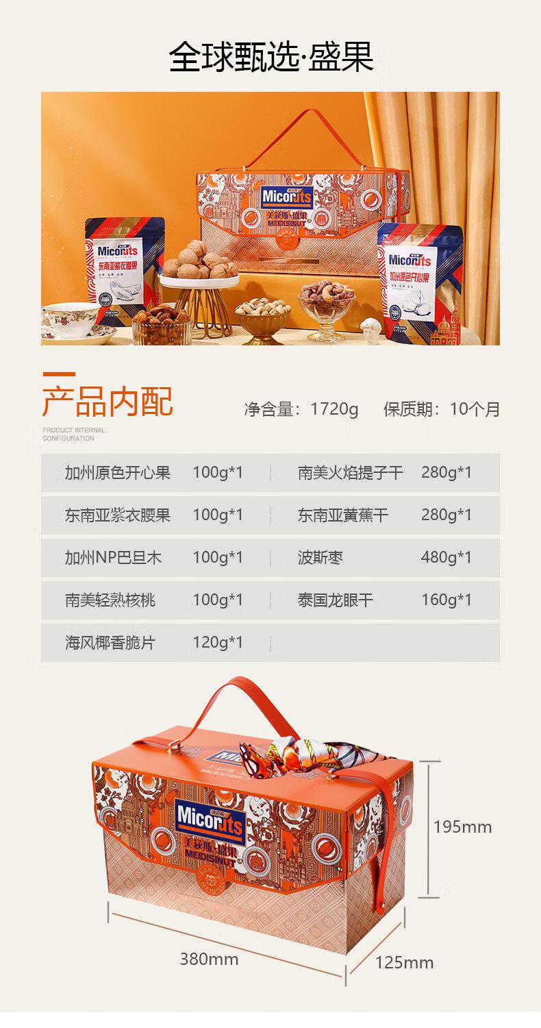 介绍:加州原色开心果100g*1 南美火焰提子干 280g*1 东南亚紫衣腰果100g*1 东南亚黄蕉干280g*1 加州NP巴旦木100g*1 波斯枣480g*1 南美轻熟核桃100g*1 泰国龙眼干160g*1 海风椰香脆片120g*1