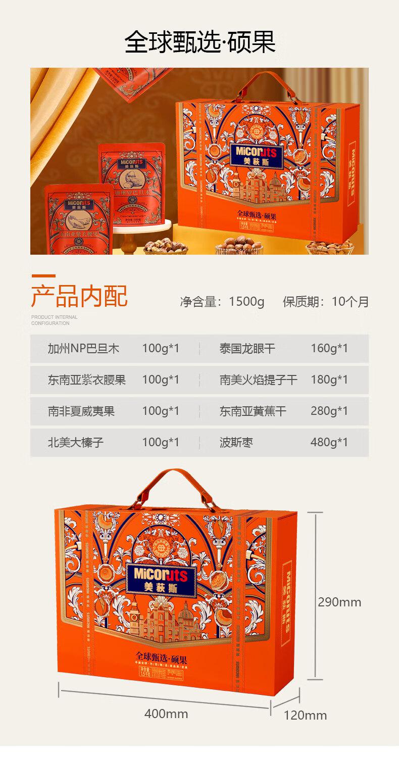 介绍:加州NP巴旦木100g*1 泰国龙眼干160g*1 东南亚紫衣腰果100g*1 南美火焰提子干180g*1 南非夏威夷果100g*1 东南亚黄蕉干280g*1 北美大榛子100g*1 波斯枣480g*1