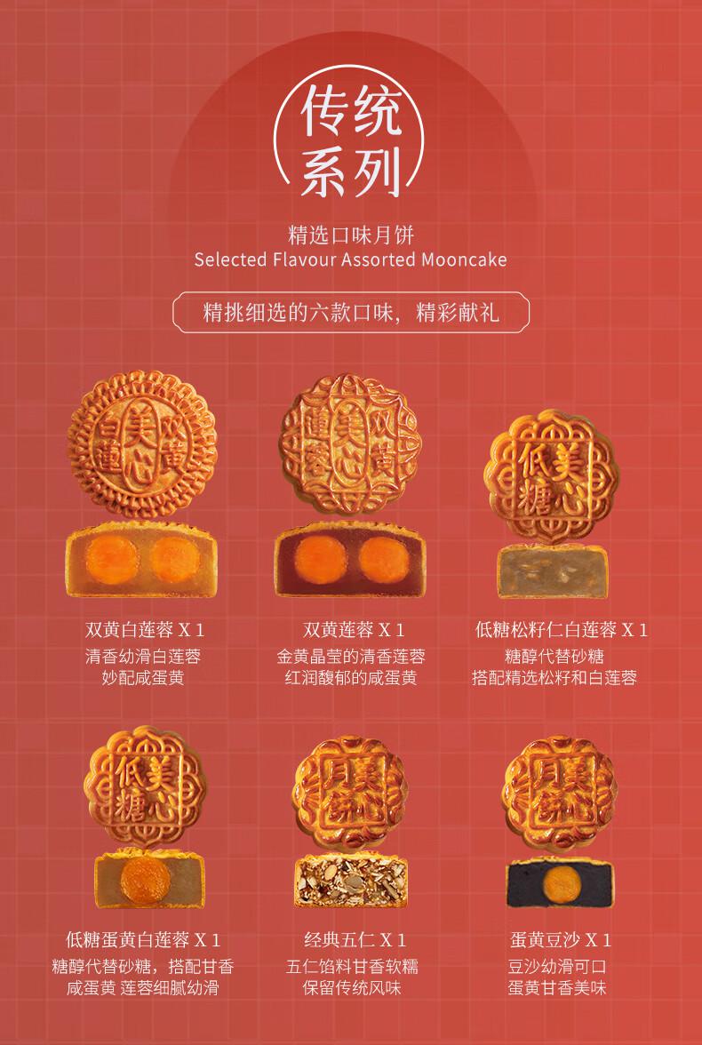 介绍:双黄白莲蓉*1 低糖松籽仁白莲蓉*1 双黄莲蓉*1 低糖蛋黄白莲蓉*1 经典五仁*1 蛋黄豆沙*1