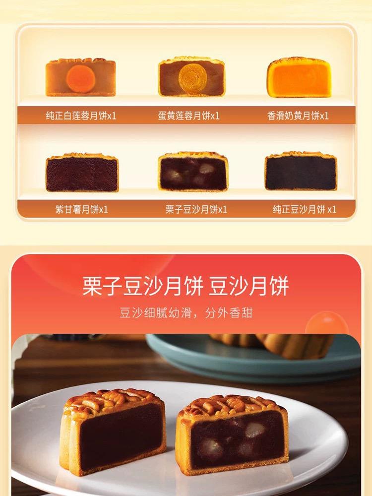 介绍:栗子豆沙月饼*1 纯正白莲蓉月饼*1 豆沙月饼*1 香滑奶黄月饼*2 柴甘薯月饼*1