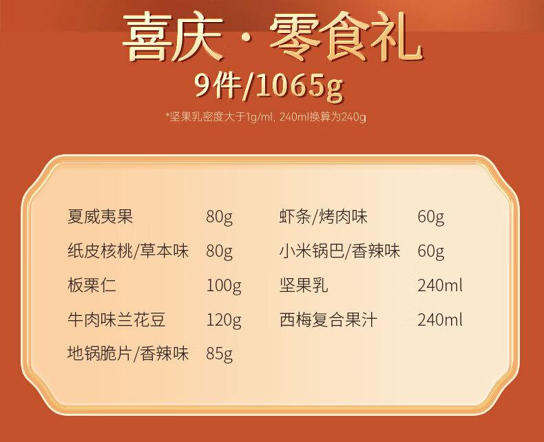 介绍:夏威夷果100g 灰枣250g 纸皮核桃120g 坚果乳240ml 板栗仁100g 西梅复合果汁240ml 蒜香豌豆205g 玫瑰红葡萄干120g 多味花生205g 日式小圆饼/奶盐味100g