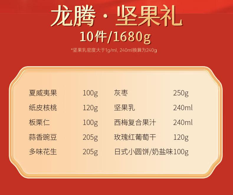 介绍:夏威夷果100g 灰枣250g 纸皮核桃120g 坚果乳240ml 板栗仁100g 西梅复合果汁240ml 蒜香豌豆205g 玫瑰红葡萄干120g 多味花生205g 日式小圆饼/奶盐味100g