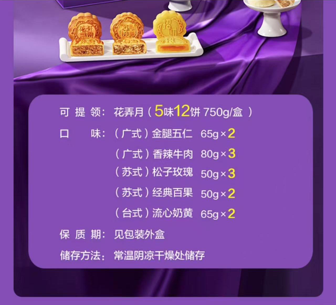 介绍:(广式)金腿五仁 65g*2 (广式)香辣牛肉 80g*3 (苏式)松子玫瑰50g*3 (苏式)经典百果50g*2 (台式)流心奶黄 65g*2